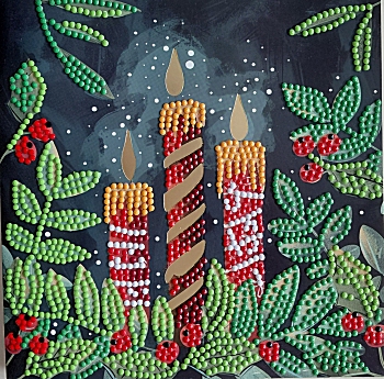 ![]() Vergroot | Omschrijving: | Vierkante kaart gedeeltelijk bedekt met diamond painting steentjes, afbeelding: drie kaarsen |